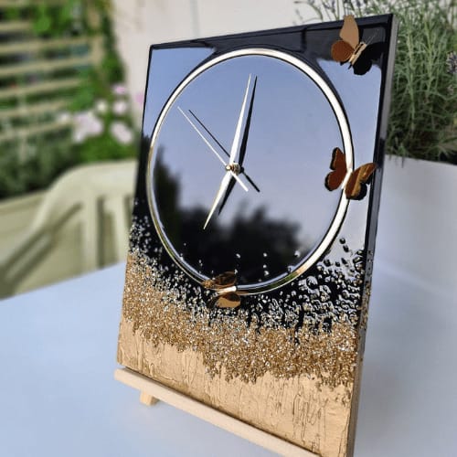 Upgrade your interior with this beautifully handcrafted Luxury Resin Table Clock, designed to bring sophistication and modern charm to any space. Made using premium epoxy resin, this clock features a glossy black finish blended with elegant gold detailing and delicate butterfly accents that create a timeless decorative piece.