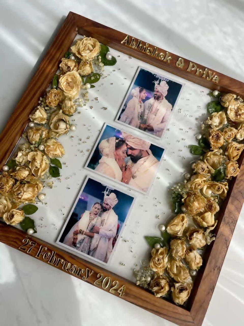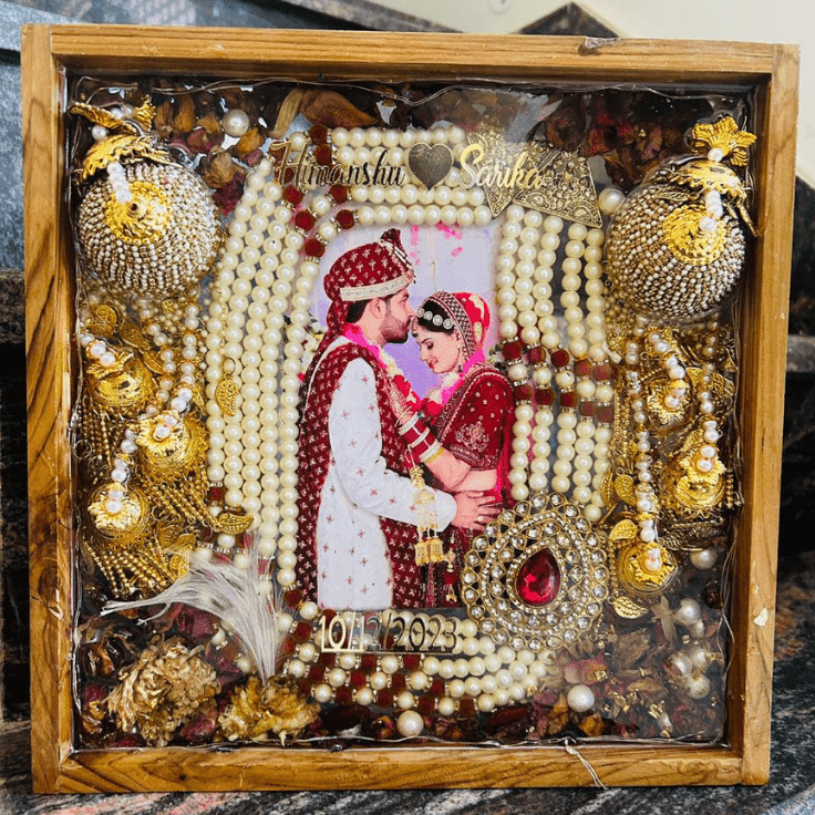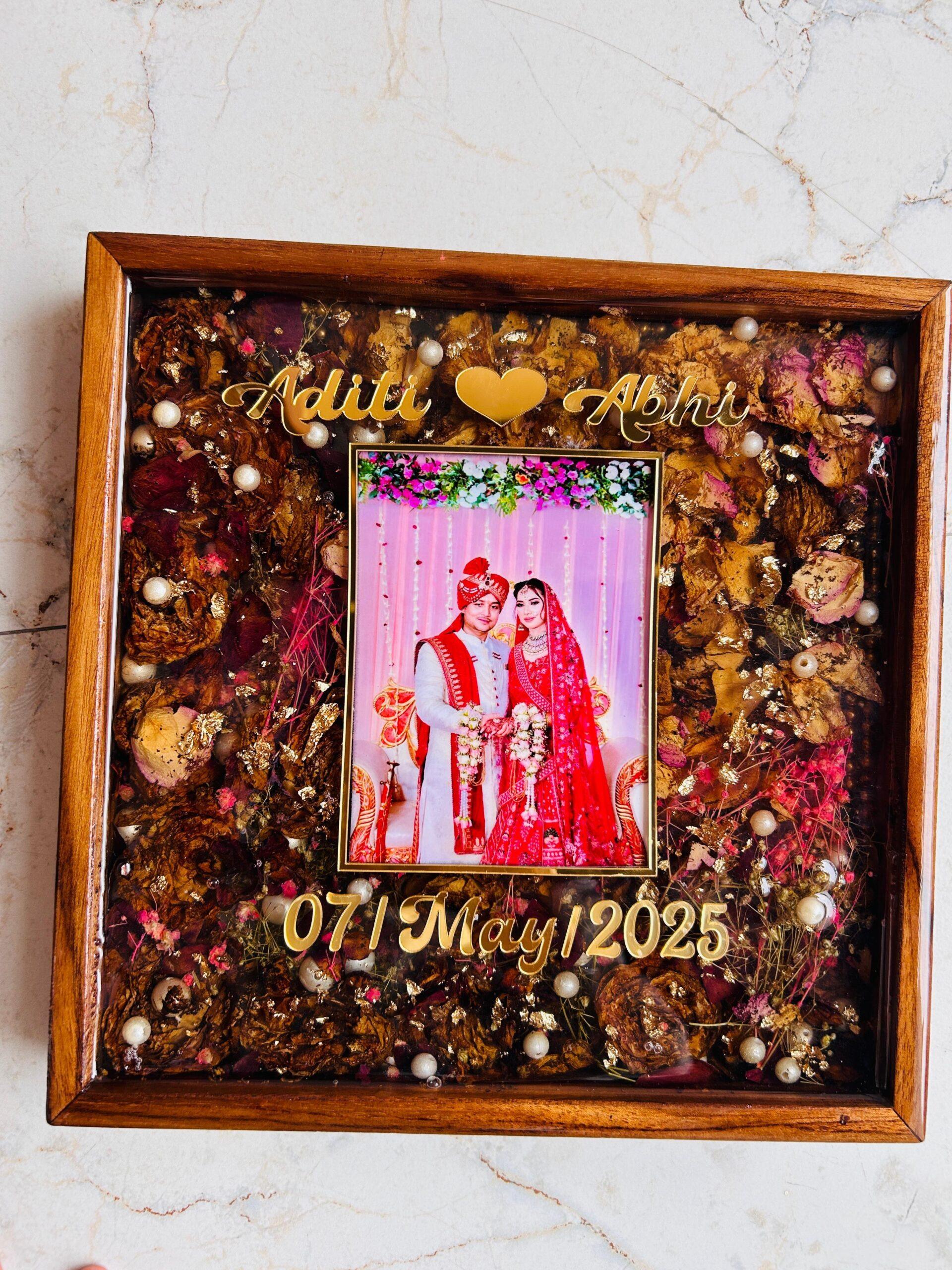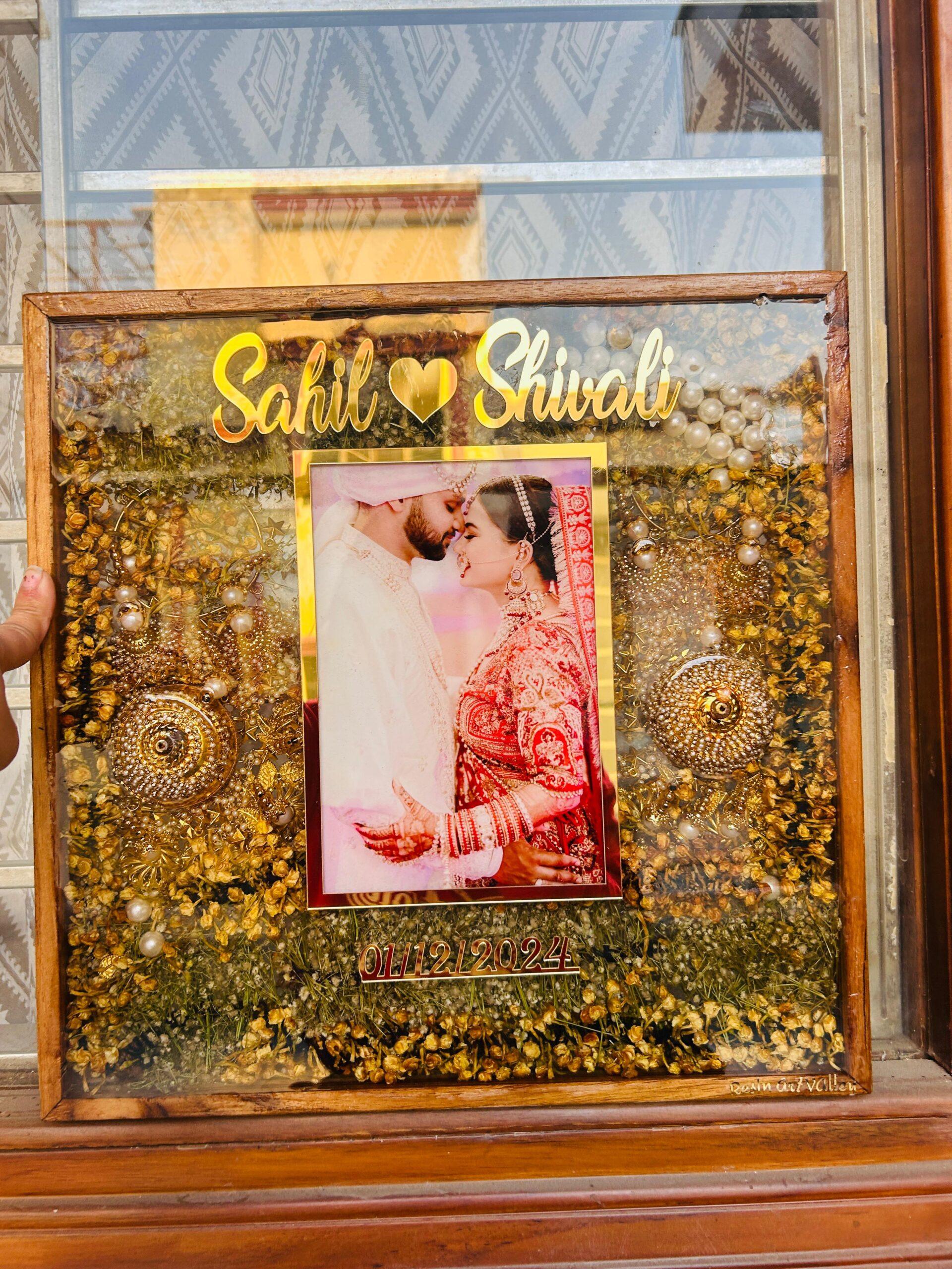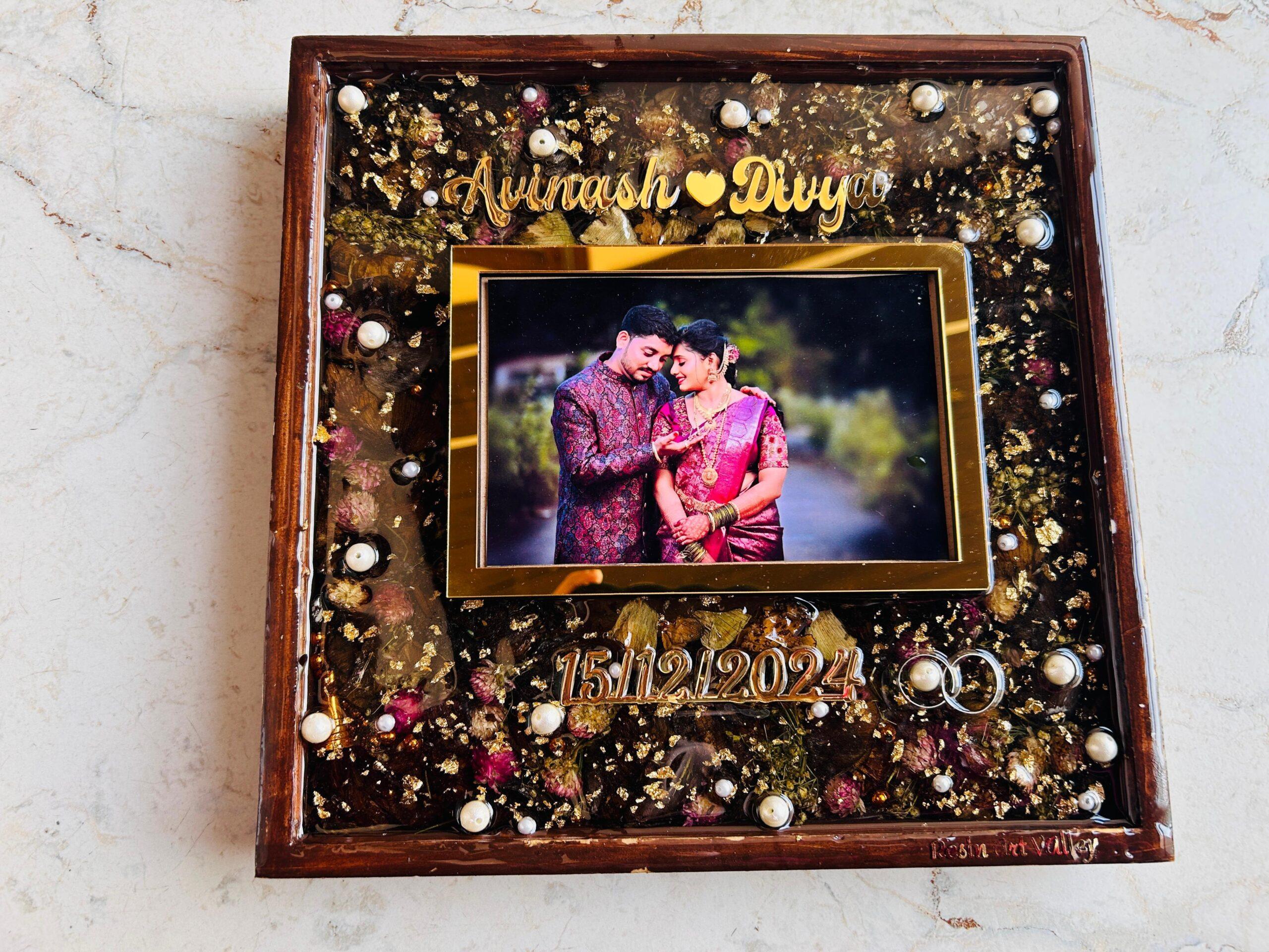 Personalize your frame with names, wedding dates, photos, background themes, gold flakes, acrylic tags, flowers, or LED lights to create a keepsake that reflects your unique love story. Ideal as a wedding memory, anniversary gift, or a meaningful home décor piece.